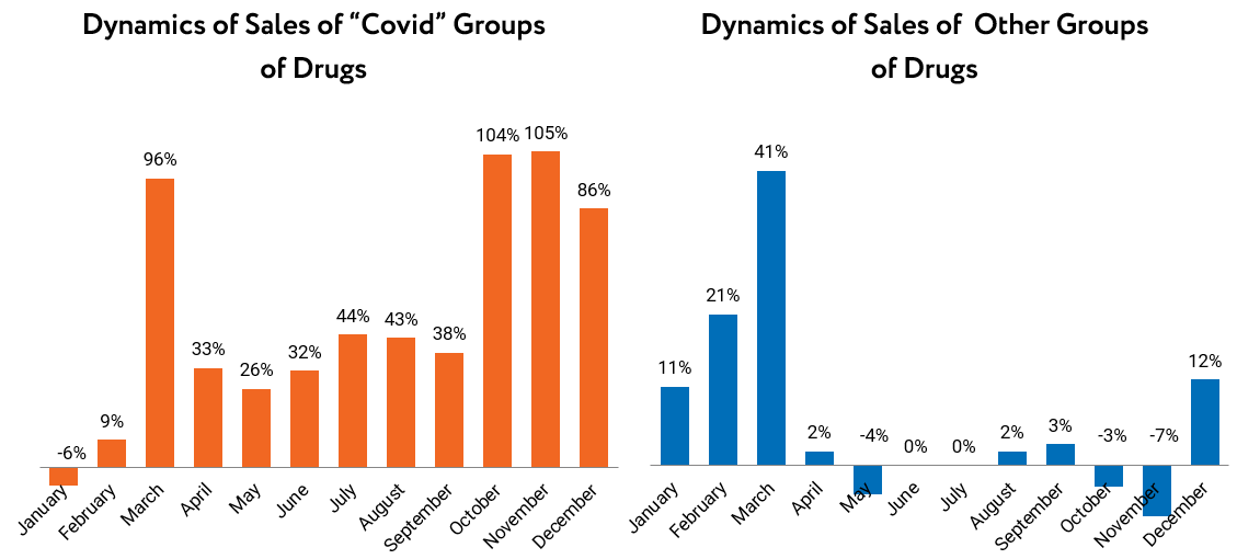 However, the spread of a new coronavirus disease markedly altered the whole market environment. Any new information about drugs that were included into a list for coronavirus treatment or prevention led to a feverish demand for them and their disappearance from drugstores. For example, at the start of the pandemic it was an antimalaria drug with an INN of hydroxychloroquine that was believed to be promising in combating the coronavirus. As a result, average monthly sales grew almost twice in April-December as compared to the pre-COVID sales level (nearly 35-40K package items per month vs. 20K in 2019).