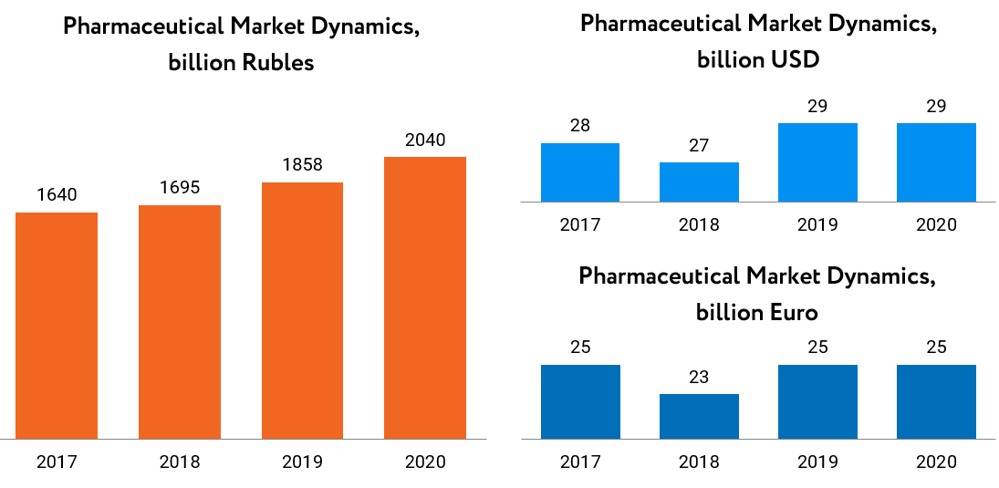The pharmaceutical market value in Russia in 2020 exceeded 2,040 billion rubles, which is 9.8% more than in 2019. In terms of dollars and euro, there was stagnation in 2020. The March ruble depreciation resulted in a situation where the market capacity did not really grow when translated. So, in dollar terms, the market value in 2020 amounted to 29 billion dollars, which is just 0.2% more than a year before. In euro, driven by a higher increase in the exchange rate (11%), market dynamics is even negative (-1.6%).