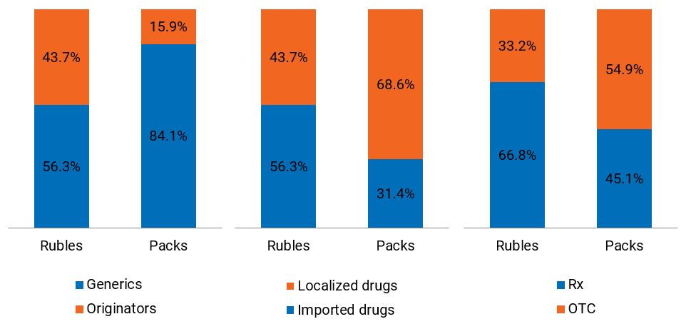 The total share of imported medicines in the market totaled 56.3% in rubles and 31.4% in package items at year-end 2020. The market growth in kind was negative both for drugs produced in Russia (-4%) and for foreign-made medicines (-3%). In ruble equivalent, locally made medicines increased by 13% and imported ones by 8%.