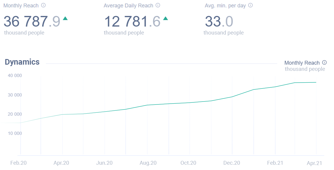 TikTok goes on conquering the audience in Russia. At the end of 2020, this social networking service ranked among the top of social networks in Russia, with its audience of 29.3 million users. By the end of the first quarter of 2021, it has already increased its audience to 36.6 million users, according to Mediascope. That said, TikTok is inferior to YouTube only by average time spent by users in the social network.