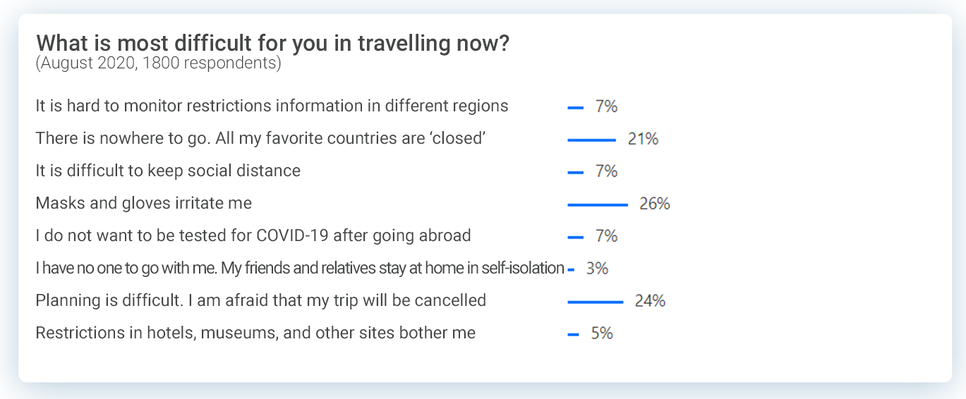 However, as for private trips, as far back as in August, when Turkey, Tanzania, and Great Britain opened their borders, Russians, though not as actively as before, still got up the nerve to go abroad. However, the lockdown period kindled many tourists’ fears and barriers. For example, every fourth Russian noted that it became hard to plan a trip, and there is a fear that it will be cancelled.