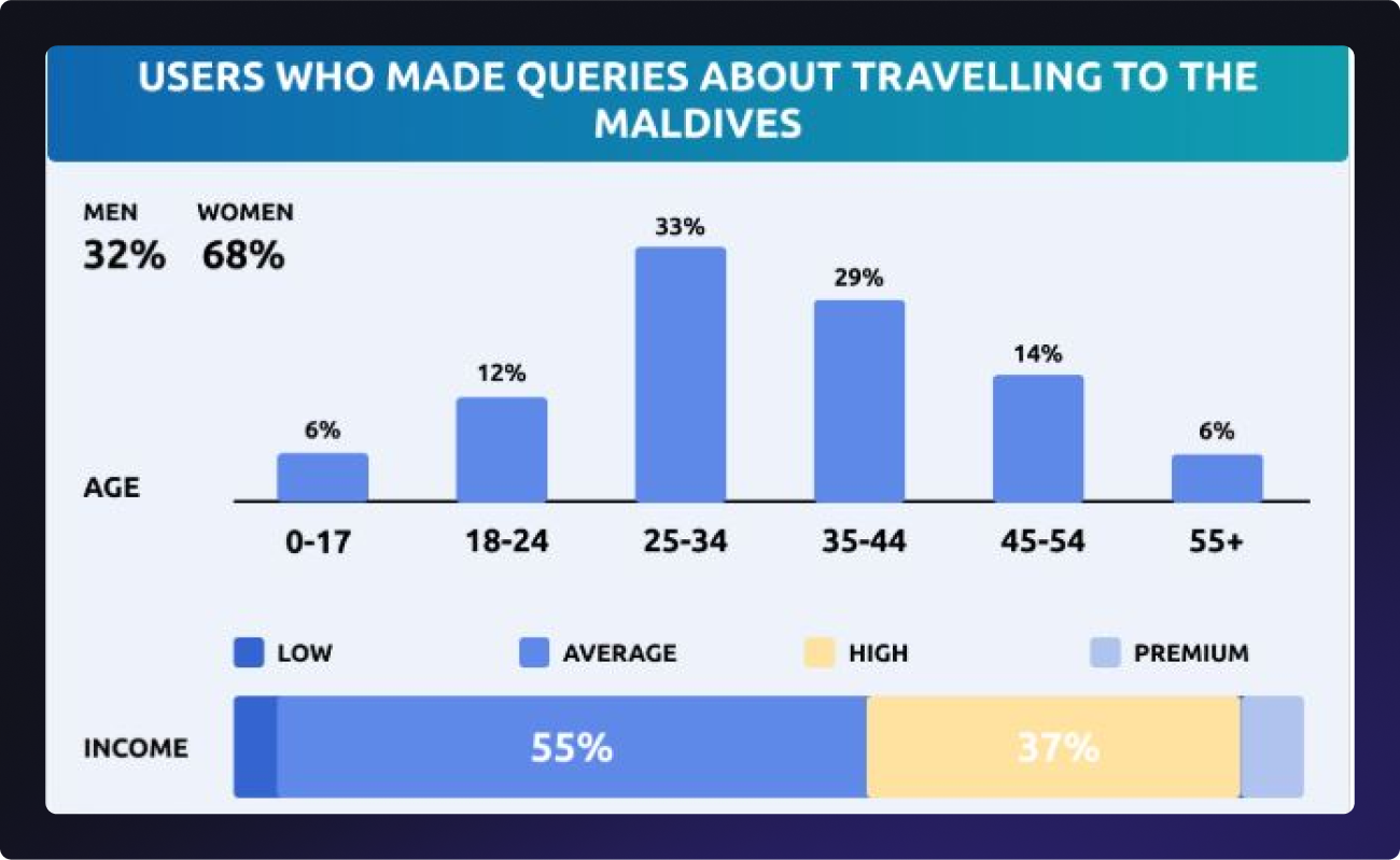 Some people think that only wealthy Russians go to the Maldives, but that's not true. As a general rule, Russian tourists who are interested in traveling to the Maldives tend to have an average (52%) or high (37%) income.