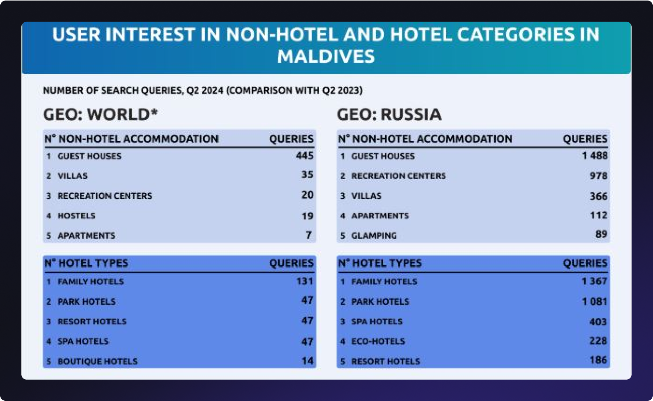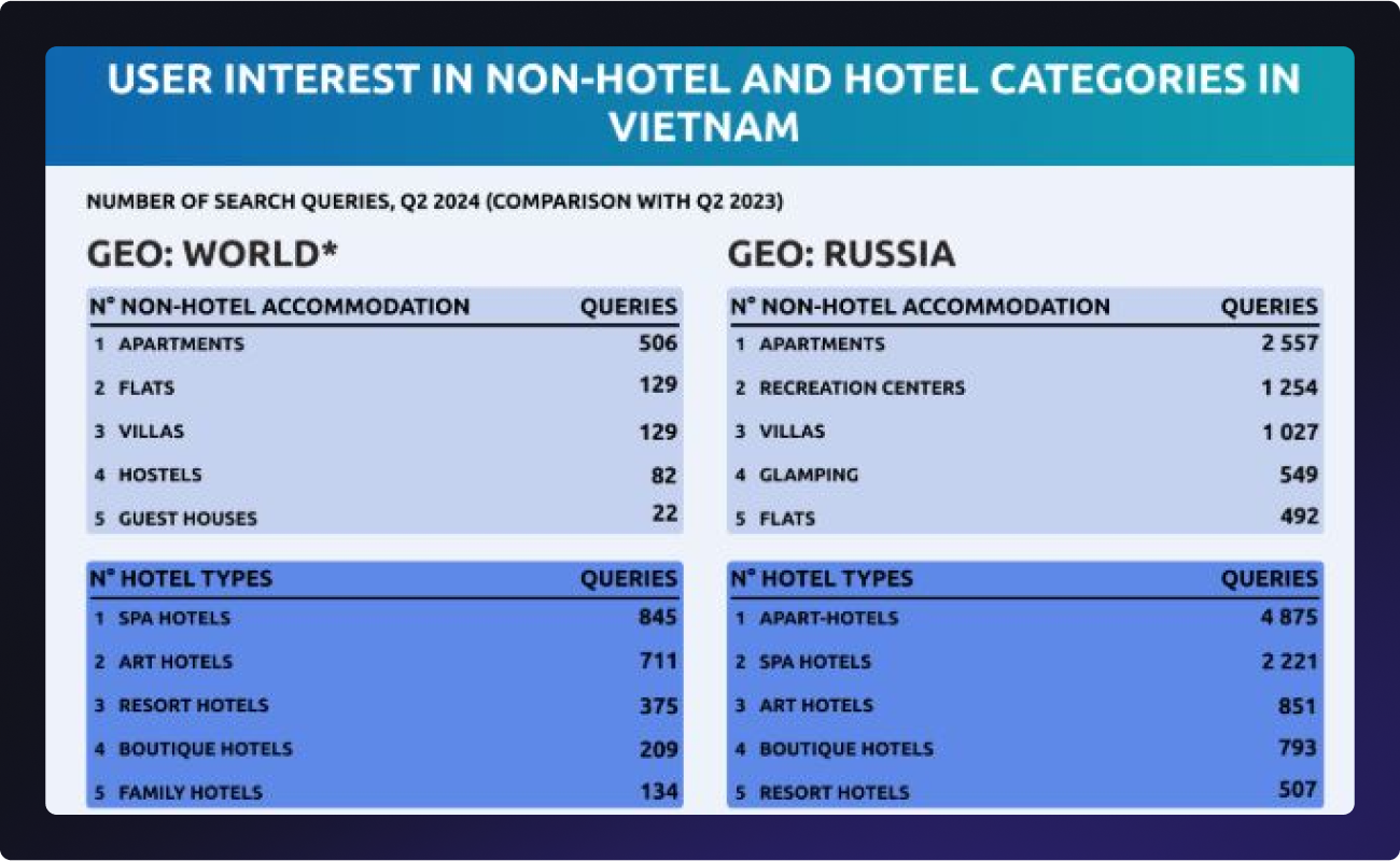Yandex search data shows that Russian travelers are interested in staying in aparthotels and spa hotels during their vacations. When they're traveling on their own, they're looking for places to stay, like apartments, rooms in recreation centers, and of course, villas.
