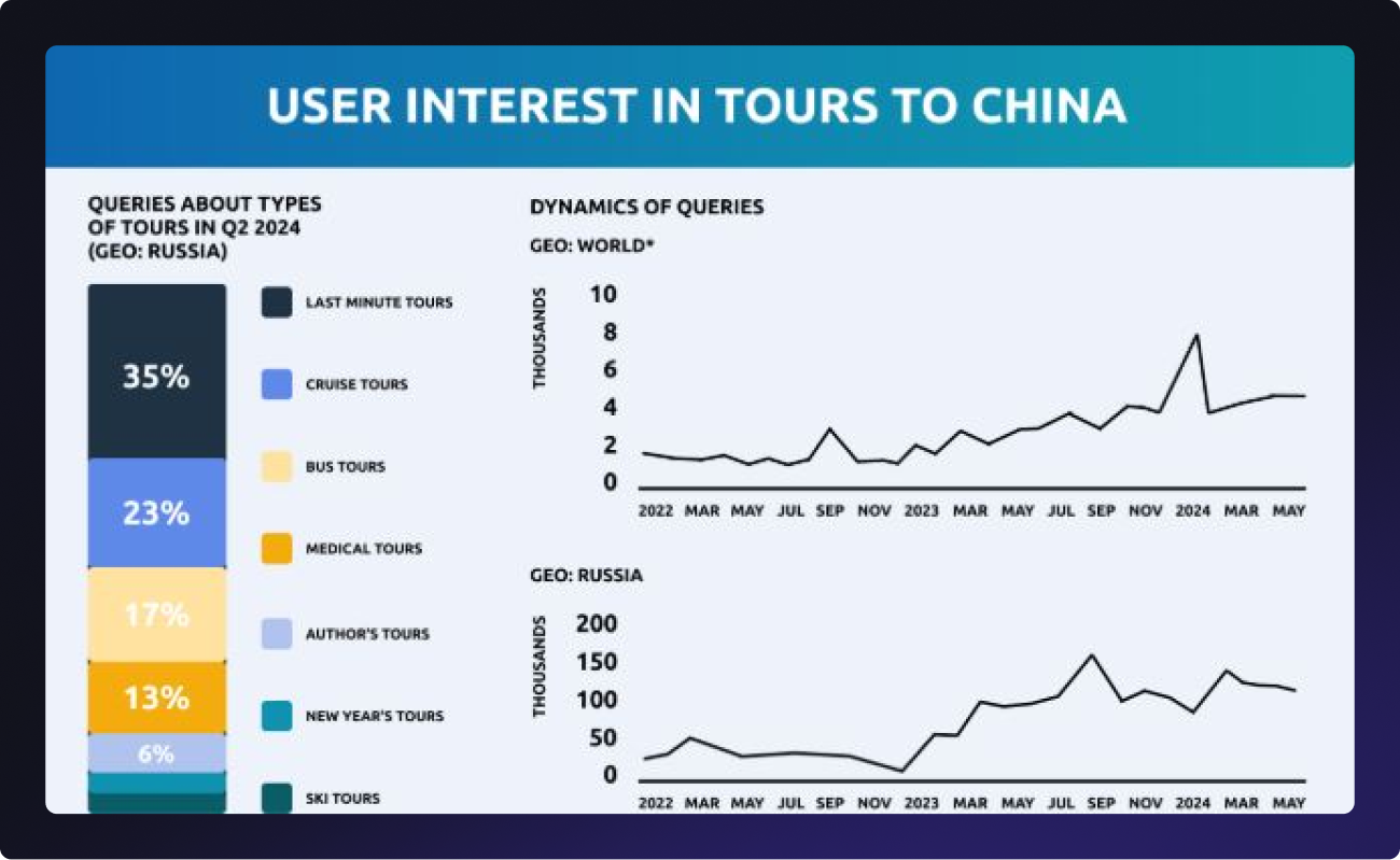 In 2024 alone, Yandex recorded 3.3 million search queries related to travel in Asia — a third more than the previous year. Most users were looking into China, Thailand, Vietnam, and Japan. This isn’t just casual curiosity anymore. It’s a decision-making phase: people are reading reviews, comparing prices, and digging into the details.