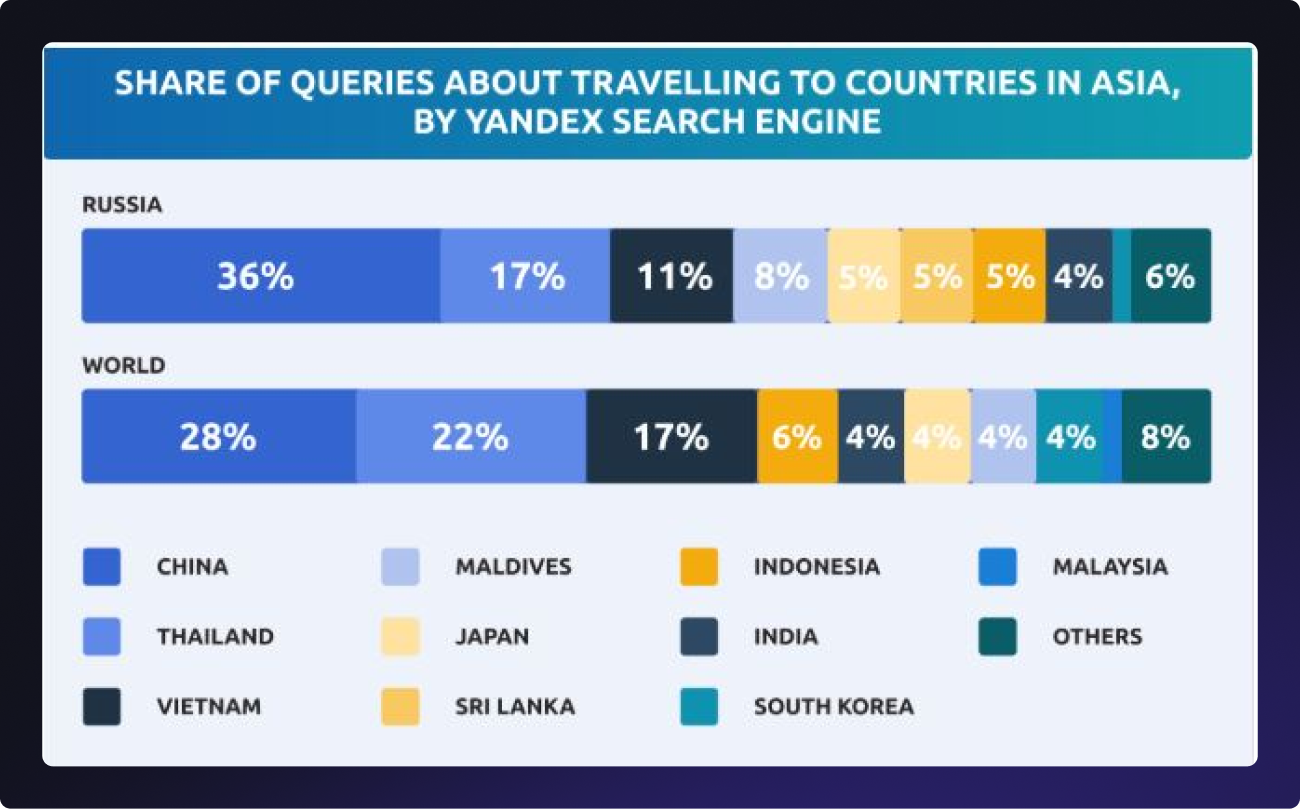 China and Thailand have both made it into the top ten most popular countries among Russian tourists. Within Asia-related search trends, China leads with 36% of queries, followed by Thailand (17%), Vietnam (11%), and Japan (5%).