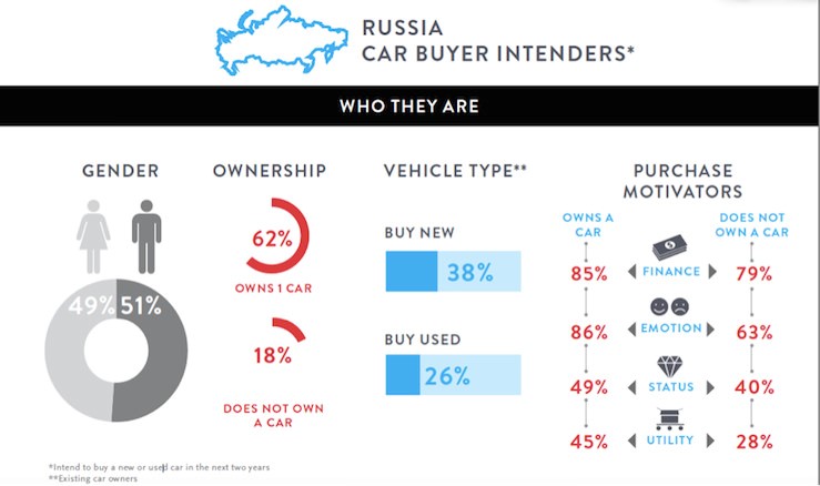Let's consider key features of the Russian car market. First of all, operation of cars in Russia differs in the fact that a car is a considerable purchase for a Russian family. A car in Russia is not an article of prime necessity; it is purchased for long and used for long duration of time. Thereby, consumers raise high requirements to such parameters as reliability, quality and relevance. In addition, there are good many car brands combining all of the above in each price category, that's why in many cases when developing an advertising campaign in Russia they rely on emotional thrust rather than on car characteristics.