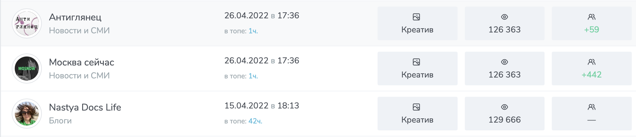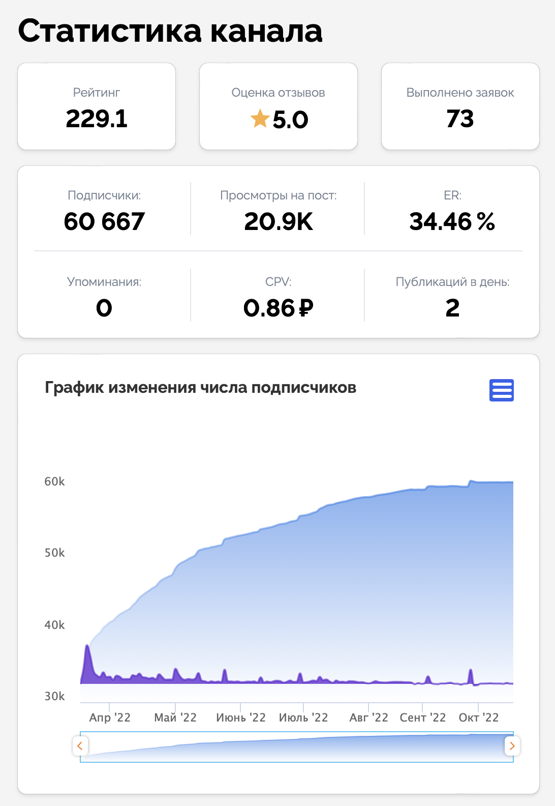 Number of subscribers is the number of active community users. As a rule, for successful advertising integration the minimum number of subscribers starts at the mark of 1 (one) thousand. However, this indicator should be taken into account along with others when choosing a channel. For example, you can see a channel with 10 thousand subscribers, while the content is watched by an average of 200 people in it. Of course, the question immediately arises whether these 10 thousand are cheating or not.