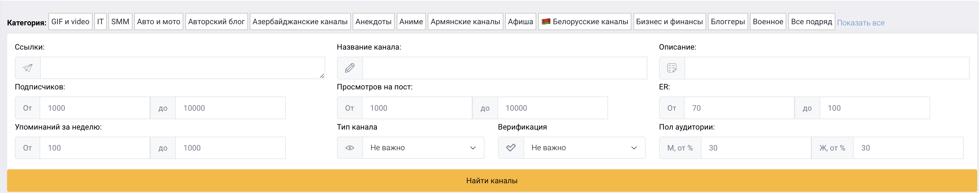 The list of channels can be set by filters, depending on the theme, placement format (1/24, 2/48, 3/72, repost, without deletion), number of subscribers, audience engagement, prices, etc. In addition, the cost of an advertising post is calculated using the built-in calculator on the platform. You need to register on the service and specify your email address for payment and placement of the advertising post.