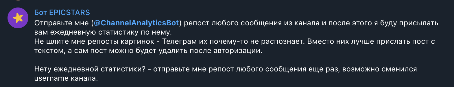 Built-in Telegram service @ChannelAnalyticsBot was developed by Vladimir Mirolyubov (CEO of Epicstars influence marketing platform) with the aim to help channel owners collect statistical data on the functioning of their platforms. The algorithm for working with the bot has a simple structure: you need to use the “Connect channel” function, select the desired one and make a repost from it to the bot. After that, the bot will send you daily statistics on the number of subscribers of the channel for the selected period of time.