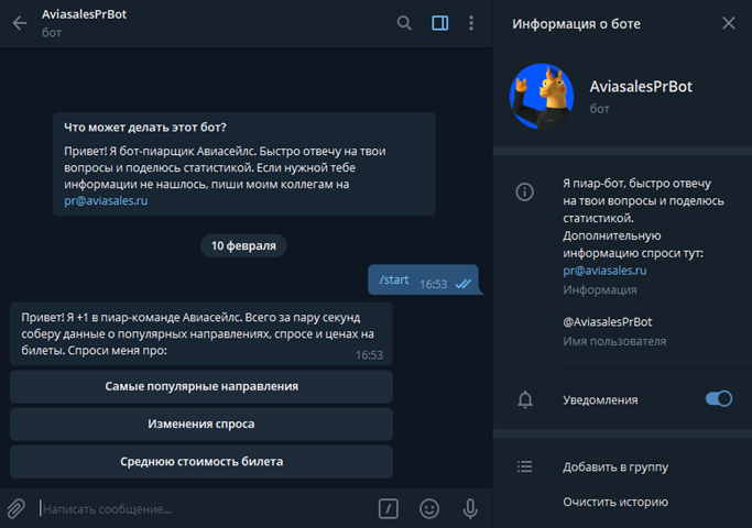 So, Aviasales has recently announced the creation of a PR bot. To create it, the Aviasales team analyzed hundreds of journalistic inquiries and selected the most popular ones. 'Now one can learn in a couple of clicks where tourists winged this winter, how air ticket prices changed within a year, and what is going on with demand', the company's message tells.