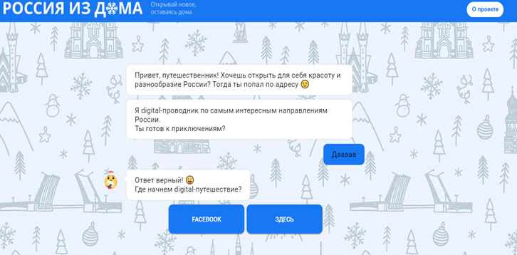Just like any other marketing tool, a chatbot can be handled creatively. So, for example, in September 2020 Facebook, backed by the Federal Agency for Tourism, launched a chatbot (a Russia From Home project) to support domestic Russian tourism and small enterprises that suffered from consequences of the coronavirus pandemic.