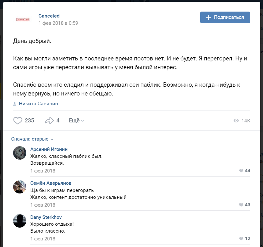 People discuss not only popular games but also those that were never released. That’s it, gamers love reading about not only successes but also failures of game developers. One of such publics was Canceled until recent times. It ‘was’ because its creators quit publishing any content almost 2 years ago. At that, the comments clearly demonstrate the interest of users to such stories, so you can easily share not only novelties and updates but also something that did not appear in the gaming industry for whatever reason.