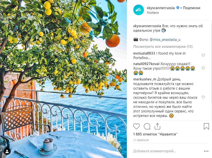 Skyscanner is reserved in its posts and on Instagram, but also encourages users to share their stories with a tag #skyscannerrussia.