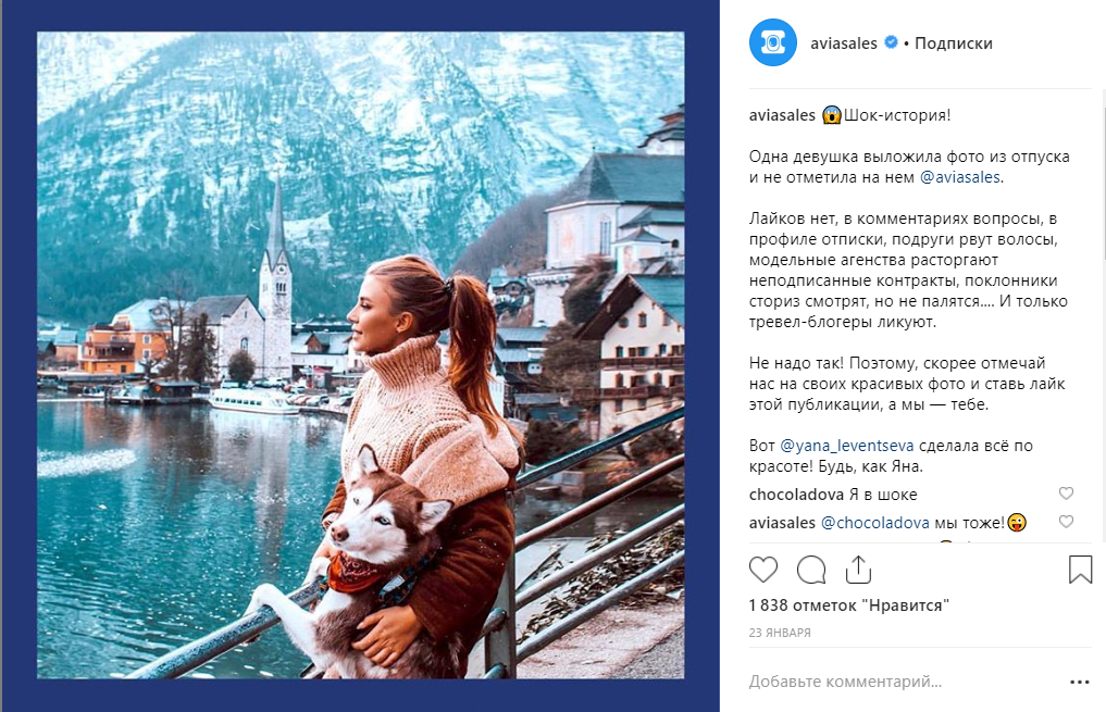 “A shocking story! One girl posted a vacation picture and did not mark @aviasales. No likes, questions in comments, unsubscribes from the accounts, friends are pulling their hair out, model agencies cancel unsigned contracts, fans watch stories, but never give it away… Only travel bloggers celebrate. Don’t be like that! Please mark us in your beautiful pictures asap and like this post, and we will like yours. So, @yana_leventseva made it all right! Be like Yana.”