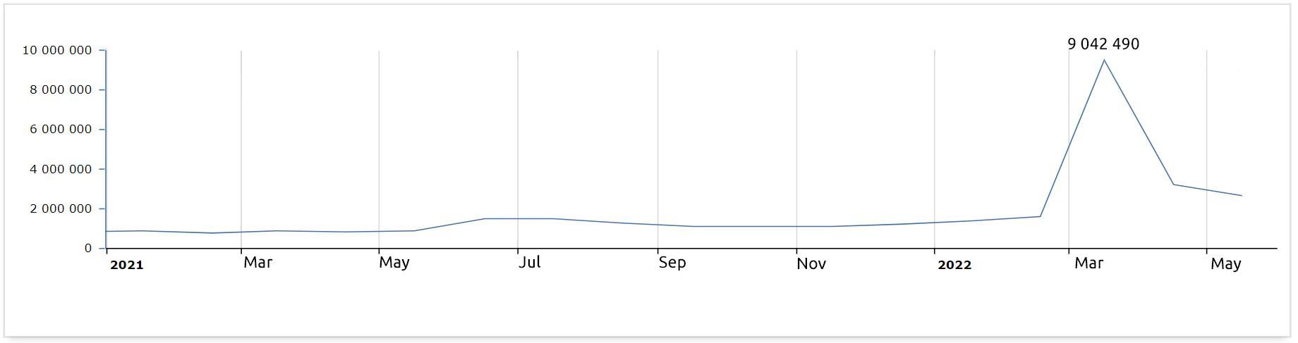 In March 2022, Russian-speaking users searched for information on VPN services on Yandex about 9.5 million times. This is 6 times more than in February 2022 and 10 times more than in March 2021. In April, interest in services slightly decreased, but still remains several times higher than the pre-crisis level.