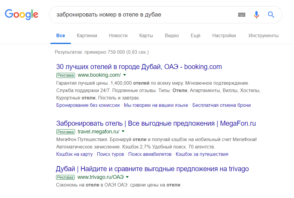 You need to understand that competition in hotel business is also high online, and room search and booking websites take top positions for most keywords. For example, a query ‘Book a room in hotel Dubai’ shows various aggregators and ads of only one Hilton hotel on first pages, both in ads and in organic results. That is why we do not recommend hotels to launch context ads; however, if you have an objective like that, below we provided a list of relevant recommendation.