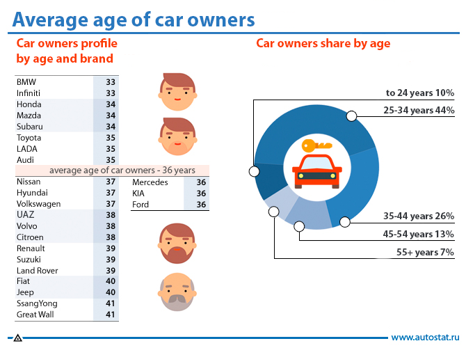 BMW and Infiniti drivers turned out to be ‘the youngest’: the average age of owners of these brands is 33 years. The ‘most mature’ ones are SsangYong and Great Wall owners: their average age is 41 years.