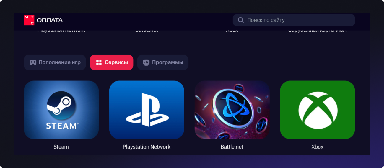 Similar services are provided by intermediaries who charge a commission for the replenishment of Steam wallets, for example, FunPay or Plati.Market. Furthermore, "global" activation keys (i.e., without regional binding) are available for purchase from online retailers such as Buka, Steambuy, Zaka-Zaka, and others.