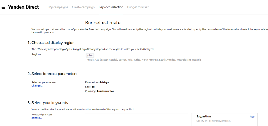 Yandex.Direct Budget Forecast is a service integrated into the Yandex advertising system. It carries out calculation of possible bids, gives a forecast of impressions and allows you to calculate the cost of advertising under specified conditions.