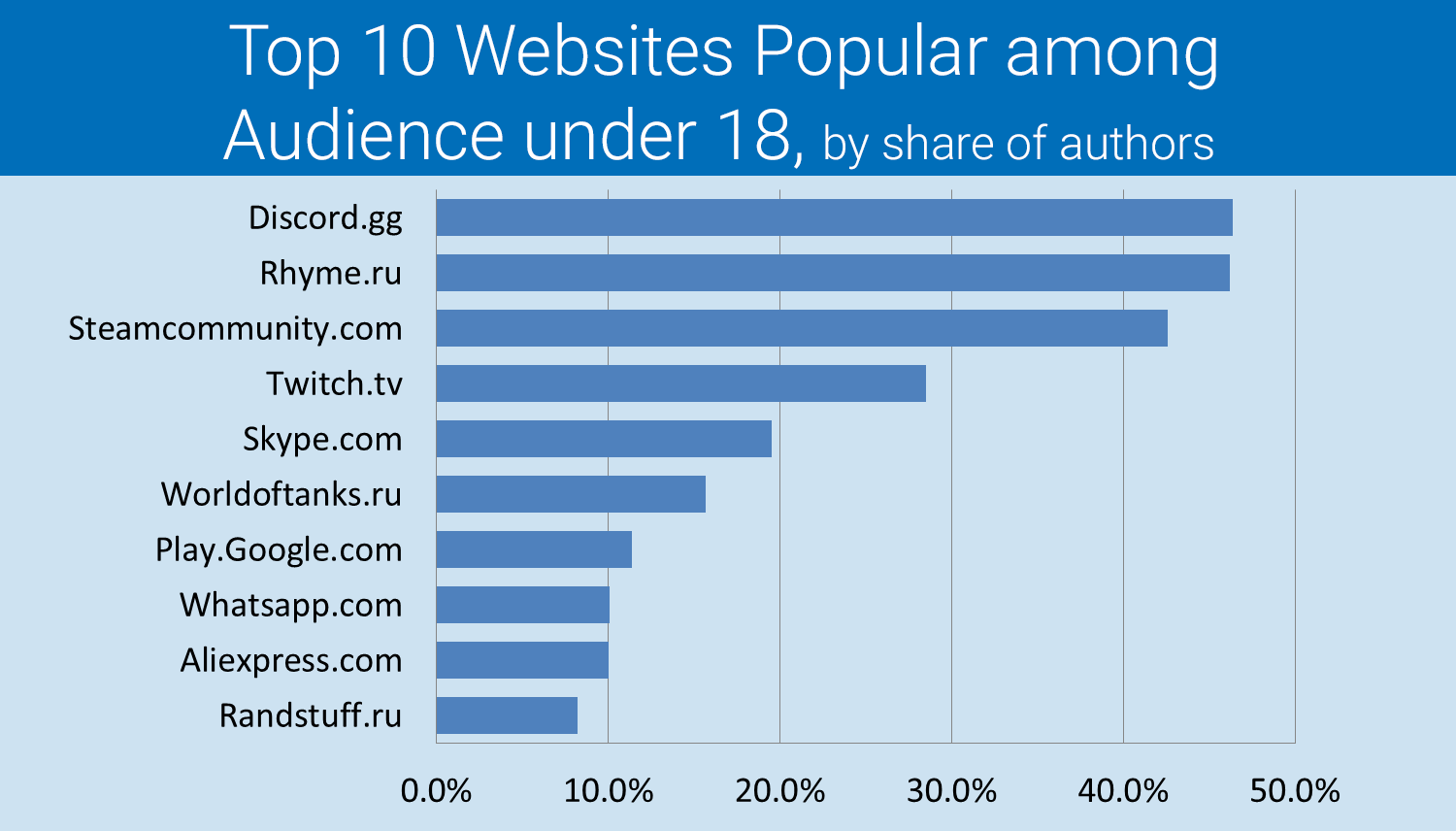 To find out interests of various age groups, Brand Analytics experts analyzed shares of authors under 18 years old among all users who quoted sites from the rating. Top 5 most youth-loved sites among all rating participants look this way: Discord (messenger for gamers), Rhyme (youth music website), Steamcommunity (gaming community), Twitch (streaming platform), and Skype (telecommunications application).