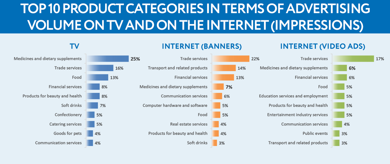 According to Mediascope, medicine ads lead the pack of advertising categories on Russian TV, taking one-quarter of the entire TV advertising volume. On the radio, ads of medicines and dietary supplements take 2nd place with a 17% share; in the press, the 4th place with a 10% share of the total volume of ads placed.