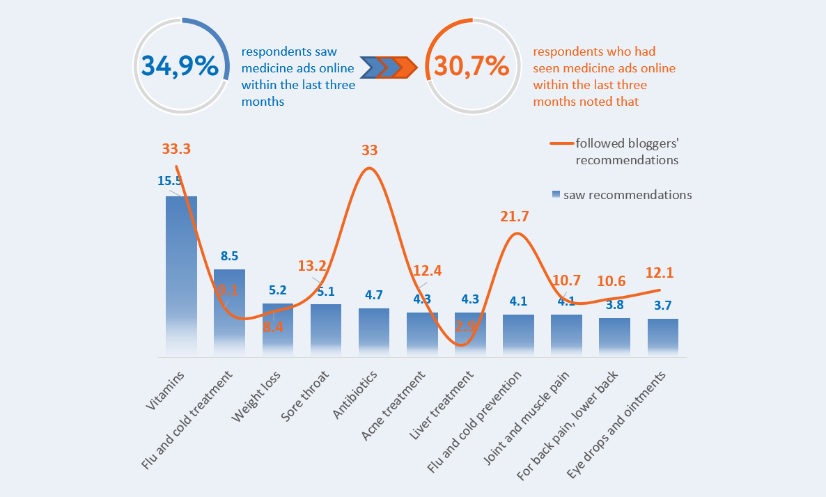 The first place in medicine categories among bloggers' recommendations is taken by vitamins. 15.5 respondents noted that they had seen information about drugs presented in blogs, and that was much more than other medicine categories. A substantial share (33.3%) of consumers who received the recommendations followed the advice taken. The second most mentioned category is anti-flu and -cold drugs (8.5%), and the third place is taken by weight loss drugs (5.2%).