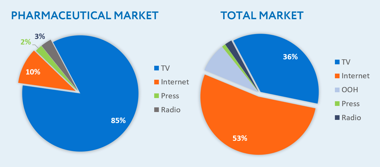 The pharma industry keeps investing most actively in TV ads. In 2020, the TV share was 85% of all advertising expenses. This is explained by the fact that large advertisers, which include pharma, typically prioritize reach capabilities of TV ads. Besides, one of the key segments consuming medicines is still the elderly.