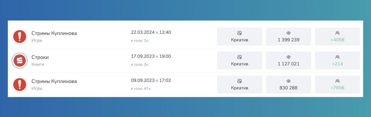 For example, Dmitry Kuplinov, a well-known blogger, streamer, and content creator, exemplifies this phenomenon. His Telegram channel boasts 883 thousand subscribers, with an average reach of 297 thousand people per advertising publication. Despite the fact that the number of subscribers on his channel is less than that of Ksenia Sobchak, he leads in both average reach (210 thousand vs. 297 thousand) and average engagement rate (11.67%), with 1.4 thousand repostss, 1.4 thousand comments, and 38.8 thousand reactions.