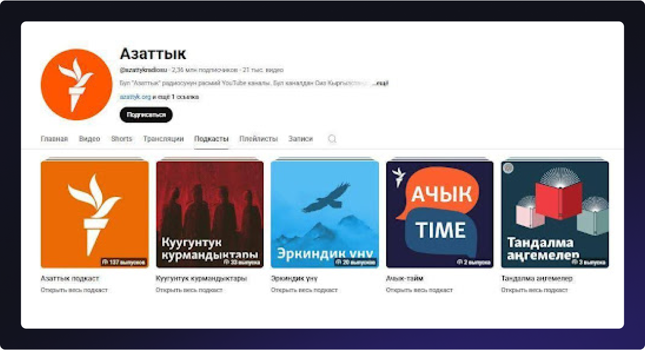 | Radio Azattyk (online) | News, analytics, independent coverage | Online (YouTube, website) | Kyrgyz / Russian |
