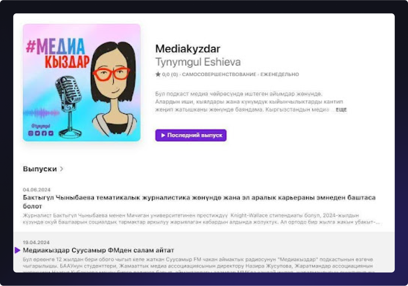 A podcast about women in media сreated by Tynymgul Eshieva, with no glossiness here. It features talks with female reporters, editors, activists, and those shaping journalism in Kyrgyzstan. The format is interviews covering the profession’s story, personal journeys, challenges, and freedom of speech. A niche but powerful project.