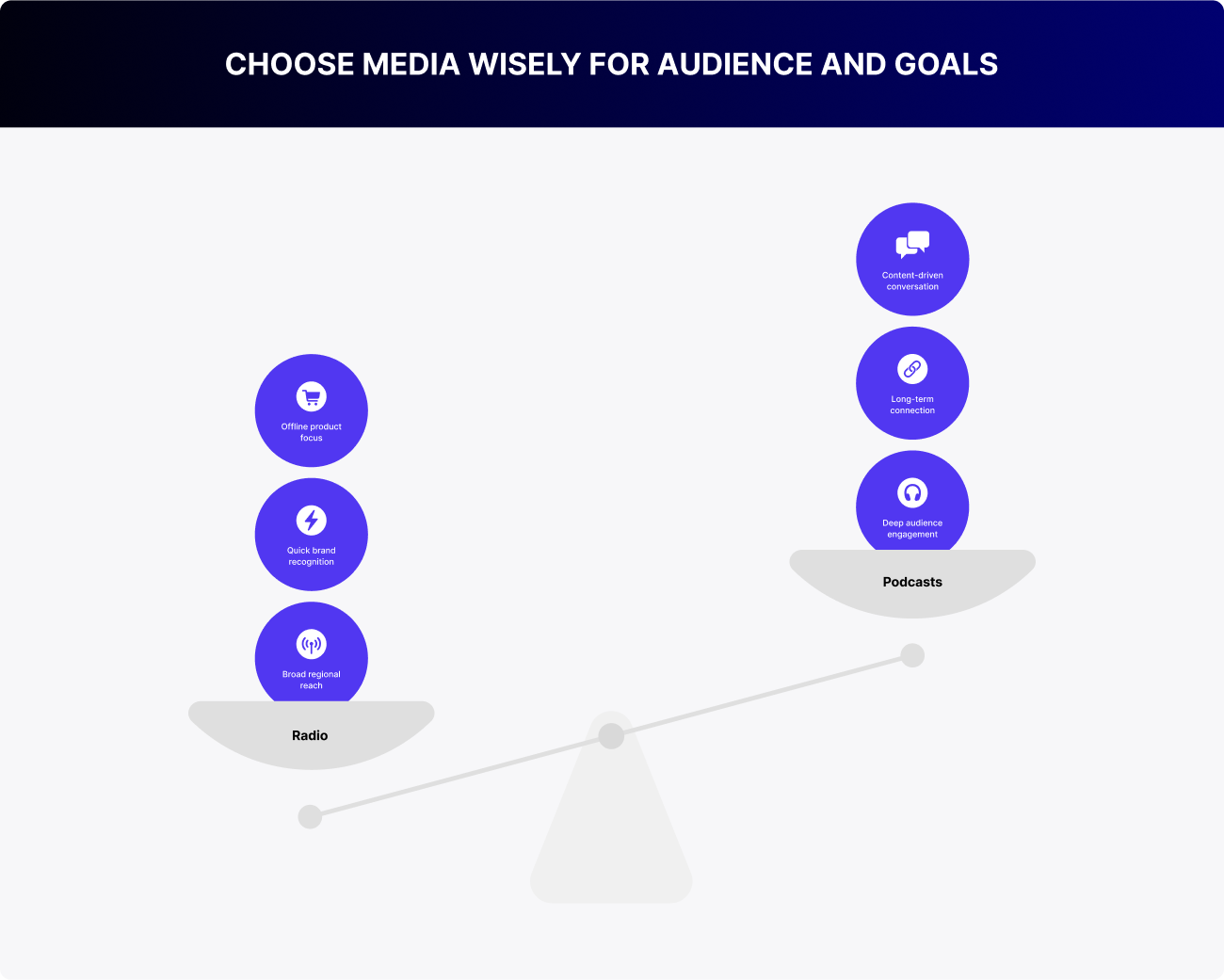 If the goal is quick regional reach, radio will deliver. If it’s about staying top of mind and building long-term connection, podcasts are the way to go. And if both matter, a combination works best. The key is not to try speaking the same way everywhere.