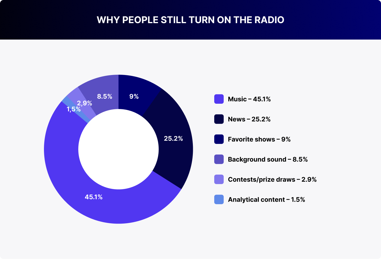 People tune in to the radio for practical reasons. Most commonly, it’s for the music, which 45.1% of listeners choose. This is followed by news (25.2%), favorite shows (9%), background sound (8.5%), and contests or giveaways (2.9%). Analytical content is hardly in demand — only 1.5% of the audience listens to it regularly. Radio remains less a place for deep meanings and more a familiar sound environment — tailored to mood, the commute, or the day’s rhythm.