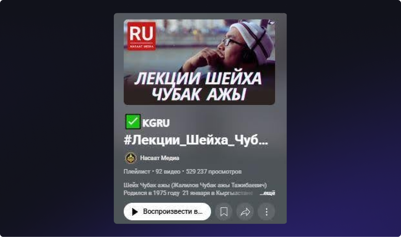 The top Kyrgyz-language podcast by listenership isn’t a startup or motivational show, but an audio legacy. These are recordings of Islamic sermons by Sheikh Chubak Jalilov, a figure who influenced an entire generation. His words are heard on the road, at home, and before sleep. Some episodes reach half a million views on YouTube. The format is archival, but its impact continues.