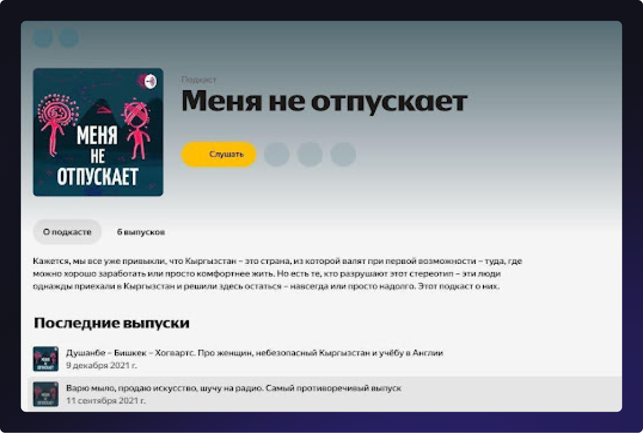 A Russian-language podcast with an international focus. Guests are Kyrgyzstanis around the world, from Chicago to Seoul. They talk about building careers, escaping poverty, and returning to Bishkek as experts. The format is pure motivational storytelling. The audience includes youth, freelancers, and those searching for their path.