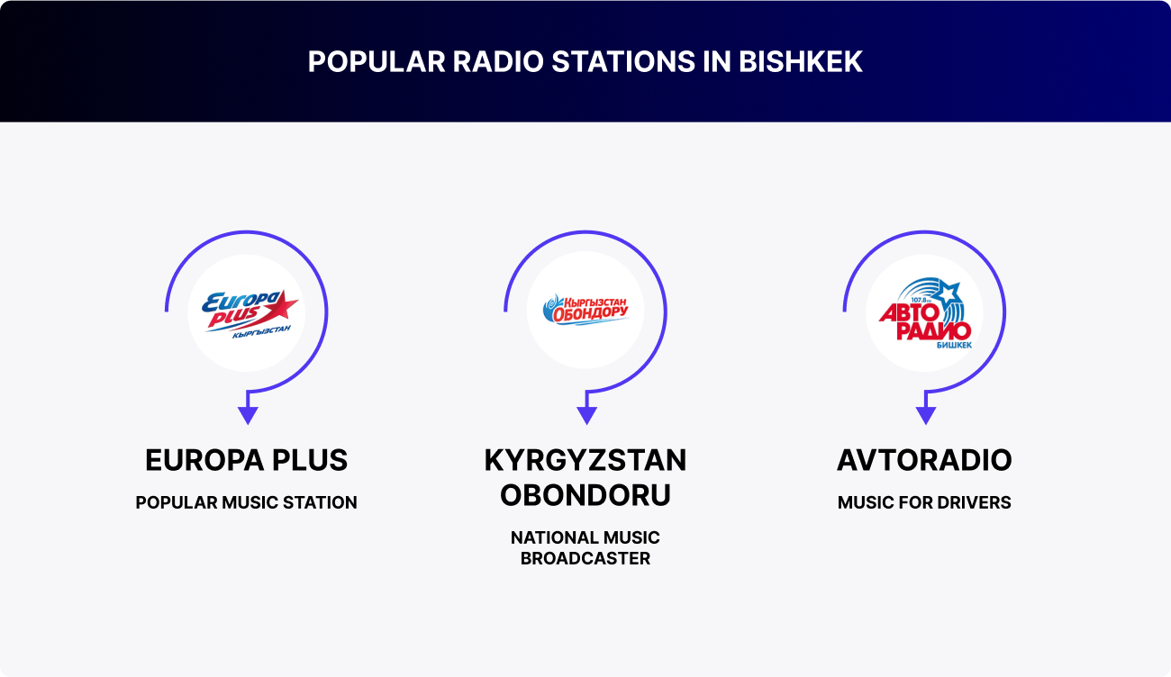 Around 34% of the population in Kyrgyzstan listens to the radio at least once a week, most often while commuting or at home. This is especially true for audiences over the age of 35 and for residents of the southern regions. In Bishkek, the stations with the widest reach are Europa Plus Kyrgyzstan (≈14.7%), Kyrgyzstan Obondoru (≈12%), and Avtoradio (≈10%).