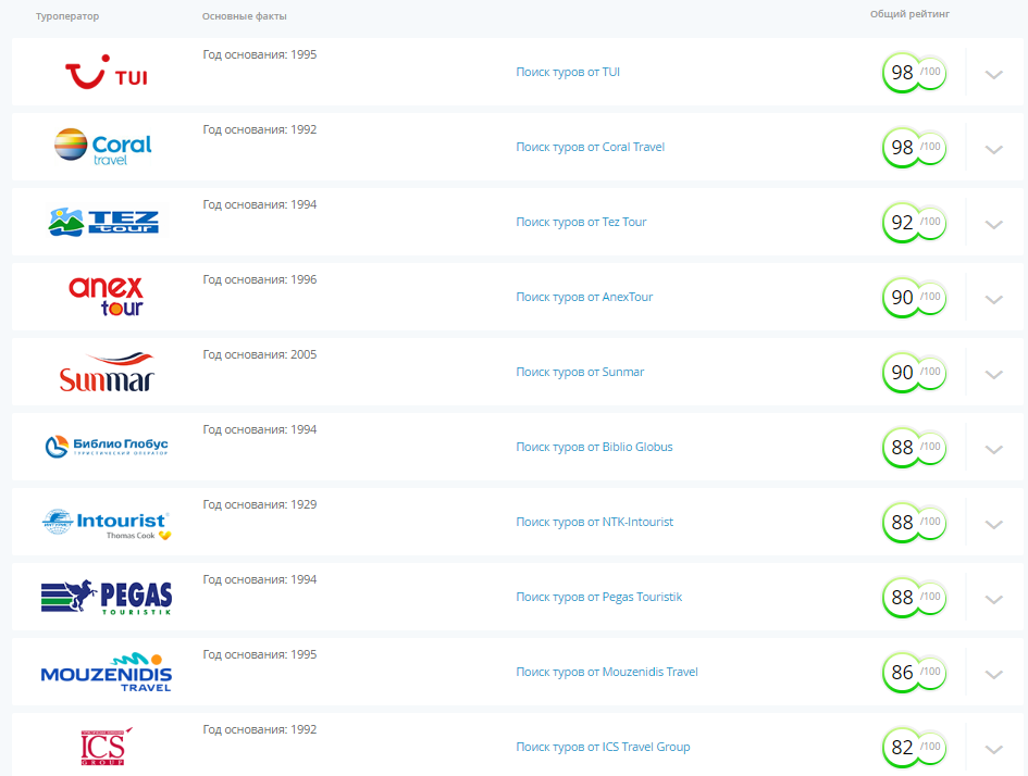 According to the counting system, 100 points are the maximum possible rating that a tour operator can get as a total sum of all criteria. 24 largest tour operators were included into the rating, evaluated by these 10 key criteria that describe a tour operator in terms of its credibility.