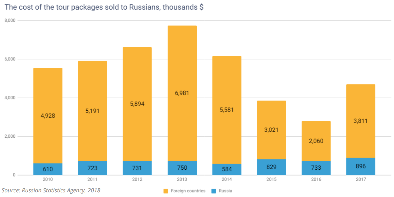 In 2017, Russians bought tour packages to other countries in the total amount of $3.8 billion.