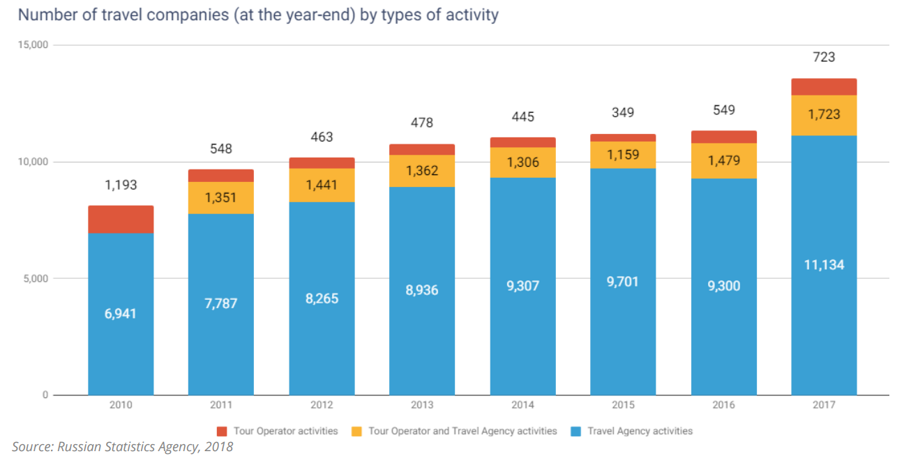 As of December 2018, the Unified Federal Register of Tour Operators contains 4,377 companies, with more than 530 of them dealing with outbound tourism. Due to reduction of the effective demand, which will obviously continue in 2019, too, the market will see further concentration expressed in natural exit of actors who do not have sufficient reserves in the face of ‘hard times’ or planning failures.