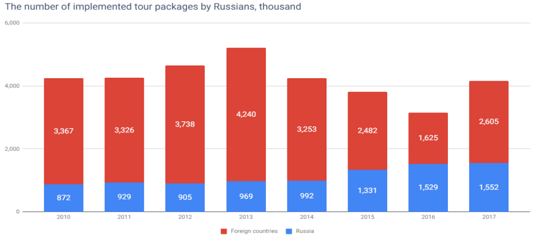 Having survived a fall in demand in 2014-2016, organized tours in Russia finally started growing. The number of tour packages to foreign countries that Russians bought rose from 1.625 thousand in 2016 to 2.605 thousand in 2017 as well.