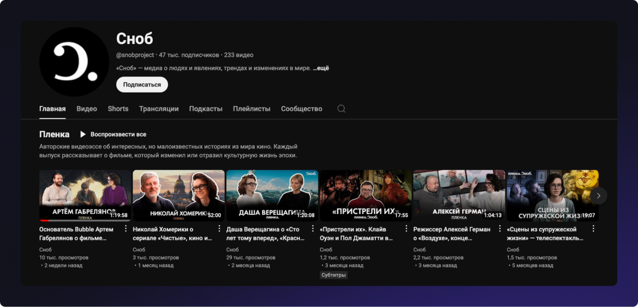 Almost all of the magazines we featured have their own YouTube channels—for example, Snob. This provides additional opportunities for brand advertising.