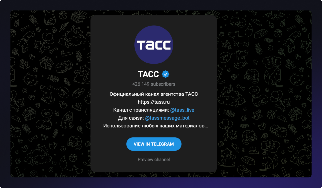 This is the official channel of the TASS news agency. The channel has 523 thousand subscribers and a citation index of 12,273. It does not feature advertisements from any third-party sources.