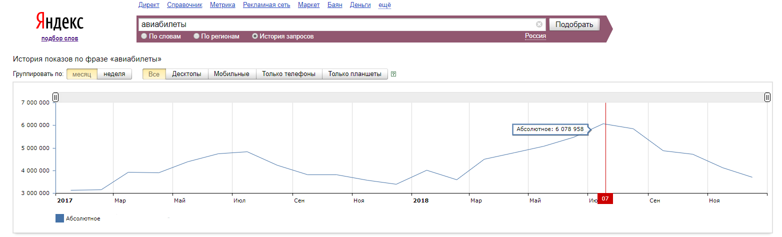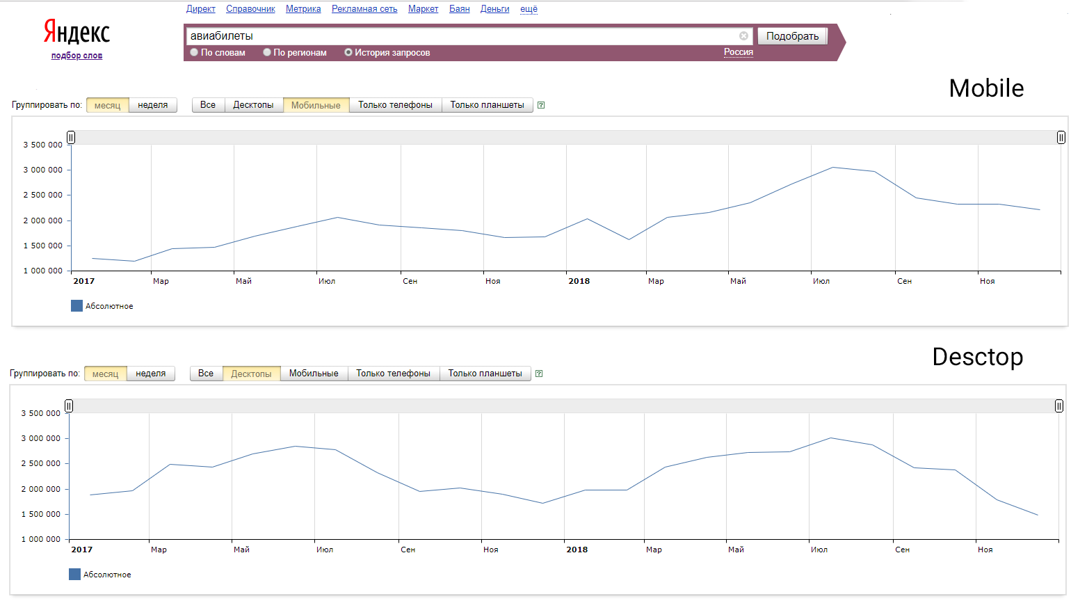 At that, the number of queries like, for example, ‘air tickets’, on a PC has changed little, if at all, within 2 years, but as for mobile devices, positive dynamics has totaled more than 30%.