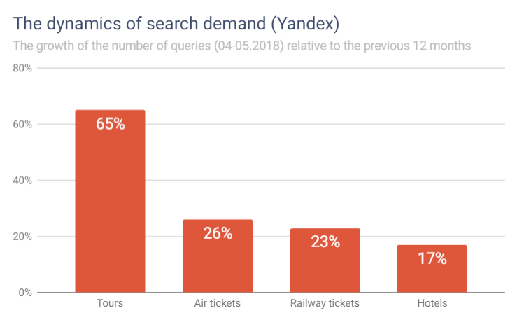 So, for instance, the number of queries ‘air travel’ only in Yandex has increased at its zenith—July 2018—almost by 25%, compared to July 2017. Positive dynamics of online search for tickets, tours, and vouchers can also be seen from other queries (package tours, buy a tour, buy air tickets, buy an air ticket online).