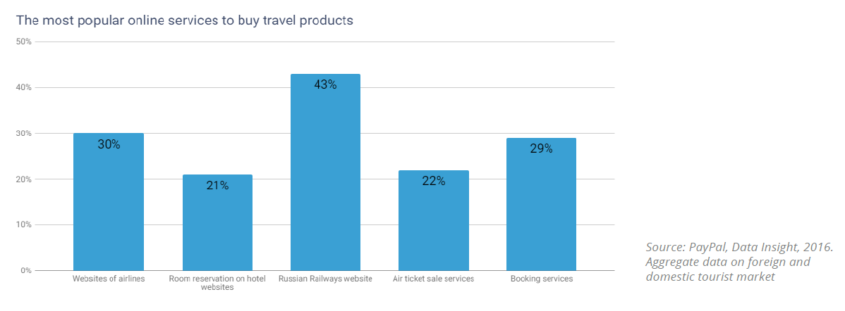 The most popular online services to buy travel products: Russian Railways website (43% of buyers used this site at least once per the last year); airlines websites (30%); hotel booking services (29%), air tickets sale services (22%); room reservation on hotel websites (21%).