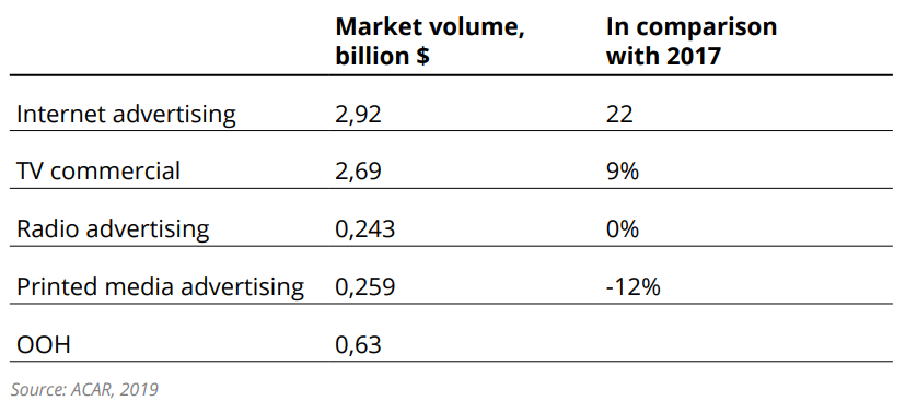 According to the Russian Association of Communication Agencies (RACA), the Russian advertising market grew by 12% for 2018 in comparison with 2017: its volume amounted to $6.7 billion.