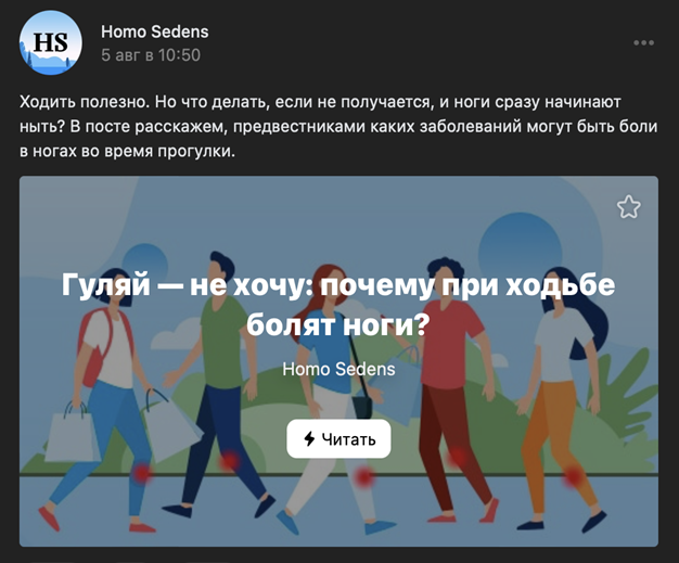 For example, the Detralex brand has managed to form a community dedicated to a sedentary lifestyle (Homo Sedens). In its VKontakte group, it actively draws attention to its product - a medicine aimed at combating varicose veins and hemorrhoids, through broadcasting the idea of the harm of a sedentary lifestyle, which is relevant for residents of megacities.