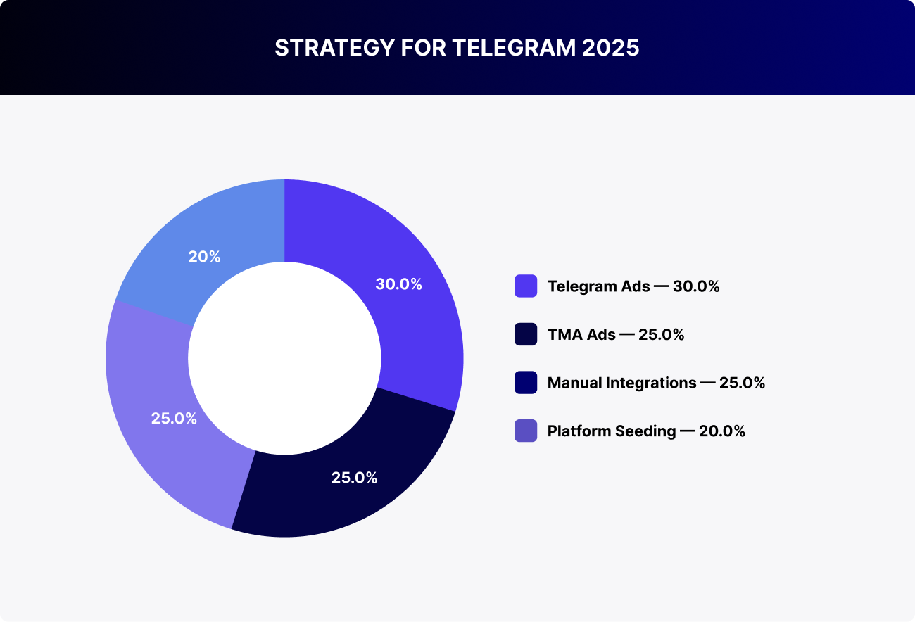 Telegram Ads drive reach — they’re the entry point. TMA Ads amplify response, turning attention into action. Manual integrations build engagement and trust, especially in niche segments. Seeding remains a solid launch tool for bursts of visibility, though its relative weight is fading. The formula 30/25/25/20 shaping up today is a reflection of real market demand. Brands are increasingly blending reach, engagement, and action into a single system.