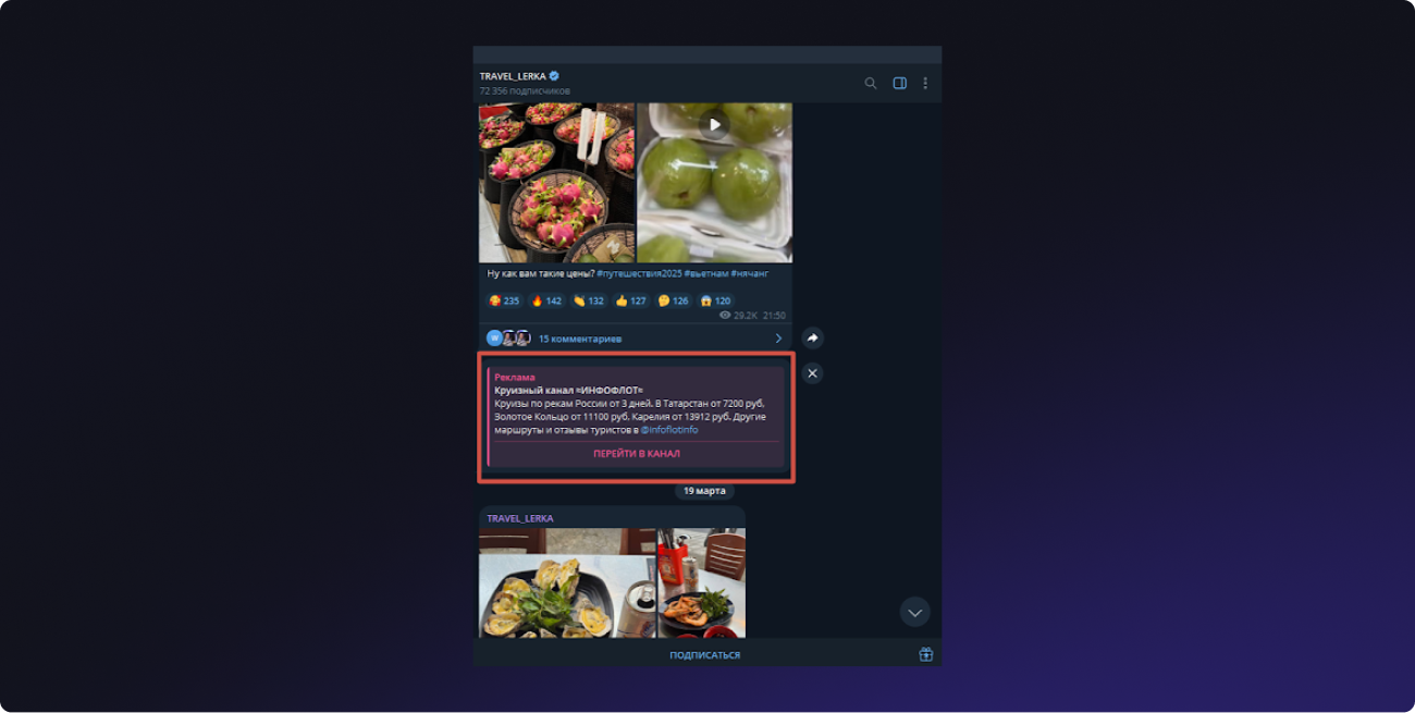 Telegram's architecture differs from other platforms, with one of its peculiarities being the lack of organic content distribution and a smart feed, which are available on platforms such as Instagram*, Facebook**, and Vkontakte. This absence eliminates activities from random users, slightly complicating the promotion of channels and advertising campaigns. Each piece of content created must clearly align with the interests of the audience. Simultaneously, the probability of attracting a suitable user remains high. There is also the possibility of native advertising integrations in author channels. The latter format is especially popular in the travel segment, as subscribers trust the personal experiences of bloggers.