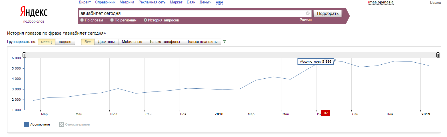One more interesting trend that is notable in online queries of Russian users is that they began looking for tickets on the date of departure more often. The number of queries ‘air tickets today’ has grown almost twice. In 2018, 84% more users looked for ‘air plane tickets today’, as compared to 2017. Within the last half a year, the number of the related queries has never dropped lower than 5,000 queries a month, and this is only about Yandex. On top of the queries are ‘air tickets today’, ‘air tickets today price’.