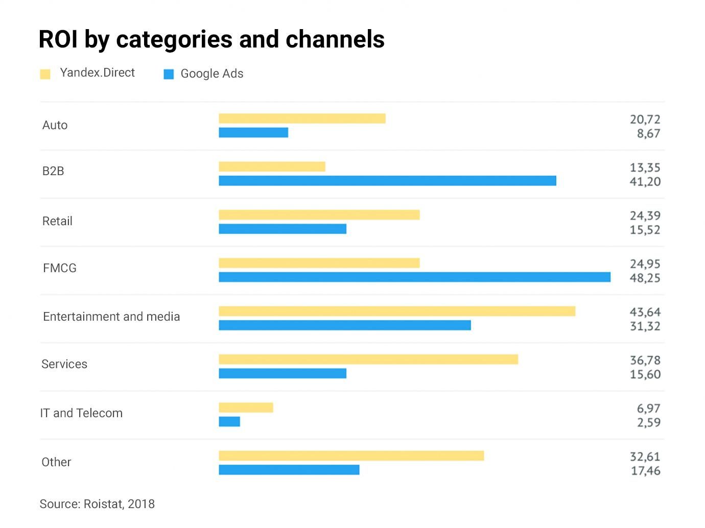 If we look at ROI in the context of industries, Google Ads showed the highest efficiency in B2B and FMCG, while Yandex.Direct leads in all others by a clear margin.